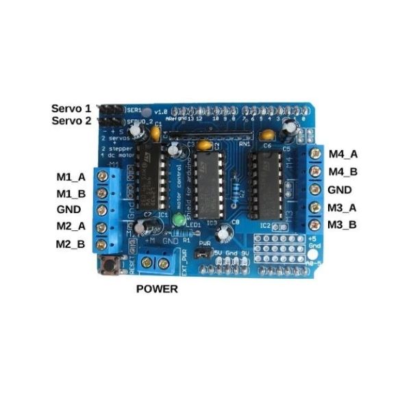 -شیلد موتور درایور L293D از دو درایور موتور L293D و یک شیفت رجیستر 74HC595 تشکیل شده است. شیفت رجیستر برای کنترل جهت درایورهای موتور 3 پین از آردوینو را به 8 پین توسعه می دهد.